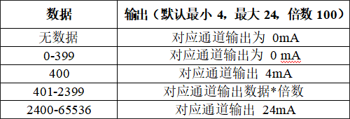 舉例:默認(rèn)最小值4mA,倍數(shù)100,RPDO1不給數(shù)據(jù)時(shí),通道輸出為0mA;數(shù)據(jù)400以下(0x01 90)時(shí),輸出均為0mA;數(shù)據(jù)01 90時(shí)輸出為4mA。