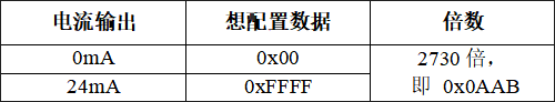 為了輸入精度,倍數(shù)可自由配置,例如:設(shè)置電流輸出0mA為0x00,設(shè)置電流輸出24mA為0xFFFF,即十進(jìn)制65535,那么倍數(shù)為(65536-0)/24=2730.6,取2730時(shí),設(shè)置數(shù)據(jù)達(dá)不到0xFFFF;由于大于24mA輸出為24mA,設(shè)置數(shù)據(jù)取0xFFFF即可,故取倍數(shù)為2731,即十六進(jìn)制的0x0A AB。
