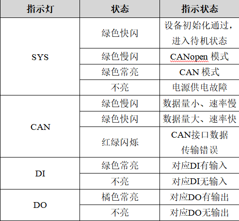 GCAN-4128模塊具有1個(gè)SYS指示燈、8個(gè)IO指示燈、1個(gè)CAN指示燈來(lái)指示設(shè)備的運(yùn)行狀態(tài)。這3種指示燈的具體指示功能及狀態(tài)如表所示。
