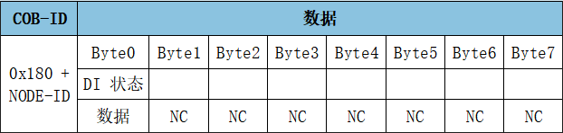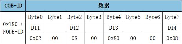 GCAN-4128模塊采用PDO(Process Data Object,過(guò)程數(shù)據(jù)對(duì)象)對(duì)數(shù)字量信號(hào)進(jìn)行采集或?qū)懭胼敵?。DI、DO每一路的具體位置均可自由配置。其中,TPDO1用于表示數(shù)字量DI狀態(tài),幀ID為0x180+Node ID,默認(rèn)幀數(shù)據(jù)第一個(gè)字節(jié)為數(shù)字量輸入狀態(tài)。