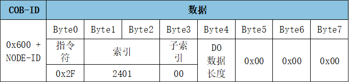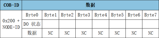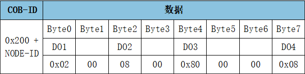 RPDO1用于表示改變(寫(xiě)入)數(shù)字量輸出的狀態(tài),幀ID為0x200+Node ID,數(shù)字量輸出默認(rèn)由一個(gè)字節(jié)來(lái)控制(寫(xiě)入),DO4在高位,DO1在低位。