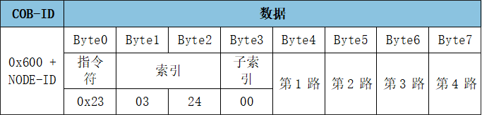 報(bào)文:ID:0x601數(shù)據(jù):23 03 24 00 02 14 28 3C,設(shè)置模塊第4路在0x3C即十進(jìn)制第60位可被寫(xiě)入,模塊第3路在0x28即十進(jìn)制第40位可被寫(xiě)入,模塊第2路在0x14即十進(jìn)制第20位可被寫(xiě)入,模塊第4路在0x02即十進(jìn)制第2位可被寫(xiě)入。