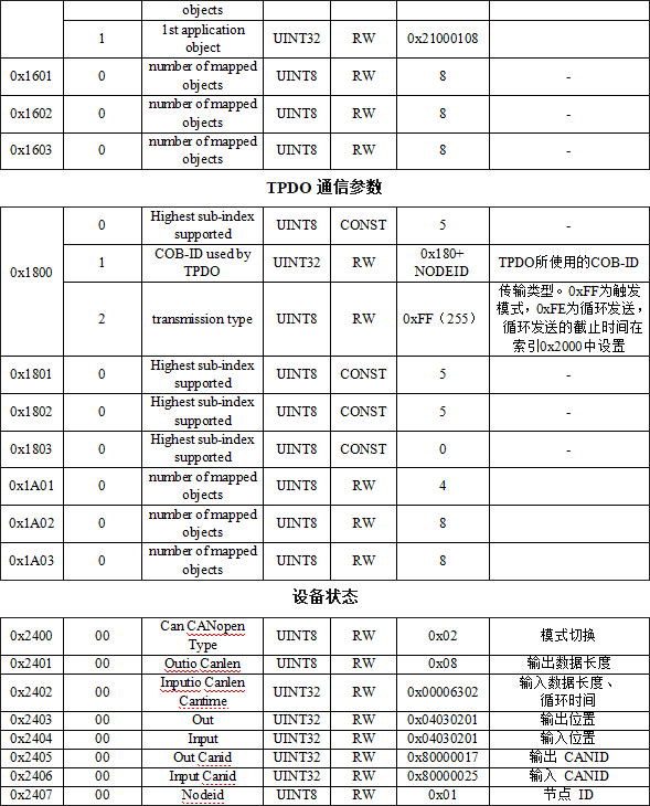 當(dāng)前狀態(tài),TPDO1用于表示數(shù)字量DI狀態(tài),如圖所示,幀ID為0x180+NodeID,默認(rèn)幀數(shù)據(jù)第一個(gè)字節(jié)為數(shù)字量輸入狀態(tài)。DI4在高位,DI1在低位。RPDO1用于表示控制(寫(xiě)入)數(shù)字量輸出的狀態(tài),幀ID為0x200+Node ID,數(shù)字量輸出默認(rèn)由一個(gè)字節(jié)來(lái)控制(寫(xiě)入),DO4在高位,DO1在低位。