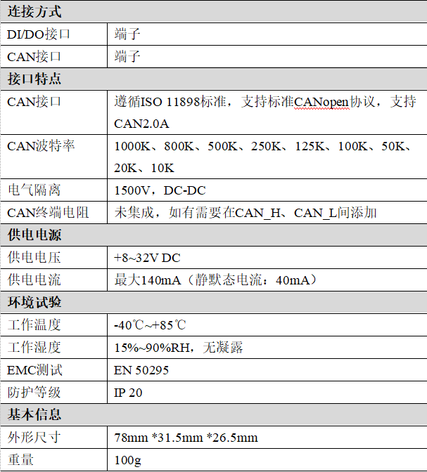 (1)CAN-bus支持CAN2.0A幀格式,符合ISO/DIS 11898規(guī)范;(2)CAN-bus通訊波特率在10Kbps~1Mbps之間任意可編程;(3)CAN-bus接口采用電氣隔離,隔離模塊絕緣電壓:DC 1500V;(4)使用8~32V DC供電(推薦標(biāo)準(zhǔn)電壓24V);(5)數(shù)字量輸入通道數(shù):4路;(6)數(shù)字量輸出通道數(shù):4路;(7)數(shù)字量輸入高電平信號(hào)(數(shù)字1):5V~32V;(8)數(shù)字量輸入低電平信號(hào)(數(shù)字0):0~2V;(9)數(shù)字量輸出信號(hào):有輸出時(shí),供電電壓-0.5V,額定輸出電流100mA;(10)數(shù)字量輸出信號(hào):無(wú)輸出時(shí),0~0.5V,不輸出電流;(11)工作溫度范圍:-40℃~+85℃;(12)工作濕度:≤95%RH,無(wú)凝露;(13)防護(hù)等級(jí):IP20;(14)EMC測(cè)試:EN50295。