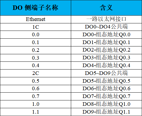 GCAN-PLC-324E/R系列的主控模塊含有上下兩排端子排,上方端子排包含一個RJ45接口和DO端子排,DO端子排分別為Q0.0~Q0.7,Q1.0~Q1.1共10個數(shù)字量輸出點,其中DO0、DO1為PNP數(shù)字量輸出及PWM高速脈沖輸出復(fù)用接口,以及供電接口,如圖所示。