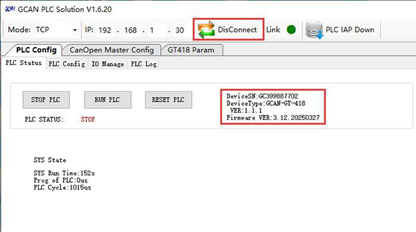 (1)打開GCAN_PLC_Solution軟件,Mode選擇TCP模式,418的網(wǎng)口連接上位機,輸入418的IP地址(出廠默認192.168.1.30),點擊“Connect”按鈕。連接成功后會顯示418的相關(guān)參數(shù)信息。