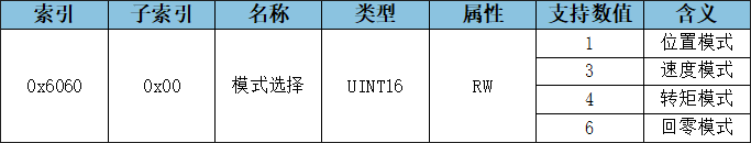 報(bào)文:ID:0x601數(shù)據(jù):2F 60 60 00 04 00 00 00,設(shè)置0x6060為4,設(shè)置運(yùn)行模式為轉(zhuǎn)矩模式。