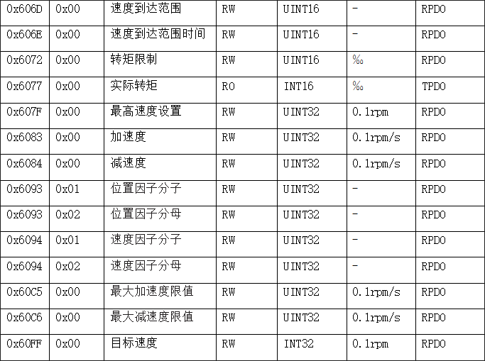 索引0x6099.1輸入3000,單位0.1rpm,即第一段高速轉(zhuǎn)速為3000*0.1rpm。索引0x6099.2輸入300,單位0.1rpm,即第二段低速轉(zhuǎn)速為300*0.1rpm。