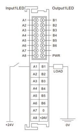 GCAN-PLC-301/302自帶8路輸入,6路輸出的數(shù)字量模塊。默認(rèn)發(fā)貨PNP型,需單獨(dú)外接電源使用(與GCAN-PLC-301/302電源隔離)。其中A1~A4為數(shù)字量輸入與高速計(jì)數(shù)輸入復(fù)用;B1~B4為數(shù)字量輸出與PWM高速脈沖輸出復(fù)用。接線時(shí)使用一字端子接頭的線纜,將端子接頭對(duì)準(zhǔn)相應(yīng)通道的圓孔插入即可;拆線時(shí),需使用一字螺絲刀,插入需拆線的通道對(duì)應(yīng)方形孔,用力向下按壓(也可輕微撬動(dòng)),此時(shí)相應(yīng)圓孔中的夾片會(huì)松動(dòng),線纜可輕松拔出。