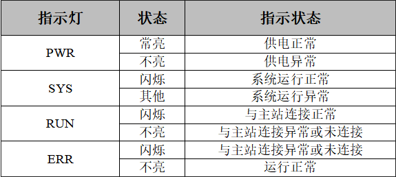 GCAN-4032 CANopen遠(yuǎn)程IO模塊有兩組指示燈,分別為系統(tǒng)狀態(tài)指示燈和IO指示燈。系統(tǒng)狀態(tài)指示燈具有1個(gè)PWR指示燈、1個(gè)SYS指示燈、1個(gè)RUN指示燈、1個(gè)ERR燈來(lái)指示設(shè)備的運(yùn)行狀態(tài)。