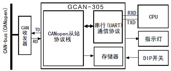 GCAN-305模塊標(biāo)準(zhǔn)工作環(huán)境如上圖所示,模塊可以支持多達(dá)12個(gè)RPDO和TPDO過(guò)程數(shù)據(jù)傳輸,適用于各種CANopen通信的場(chǎng)合。模塊同時(shí)具有體積小巧、實(shí)時(shí)性高等優(yōu)點(diǎn),使GCAN-305模塊非常易于嵌入到用戶設(shè)備中,讓用戶的設(shè)備即刻擁有強(qiáng)大的CANopen總線功能。